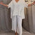 The V-neckline subtly enhances the décolleté, while the wide-leg pants flow effortlessly, offering complete freedom of movement.